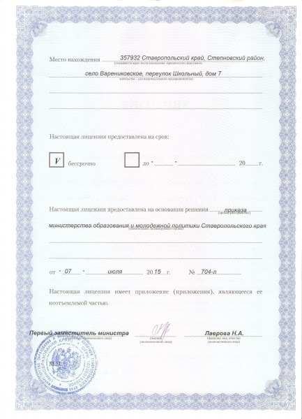 - Места осуществления образовательной деятельности по дополнительным образовательным программам: 357932 Ставропольский край, Степновский район, с.Варениковское, пер. Школьный, 7